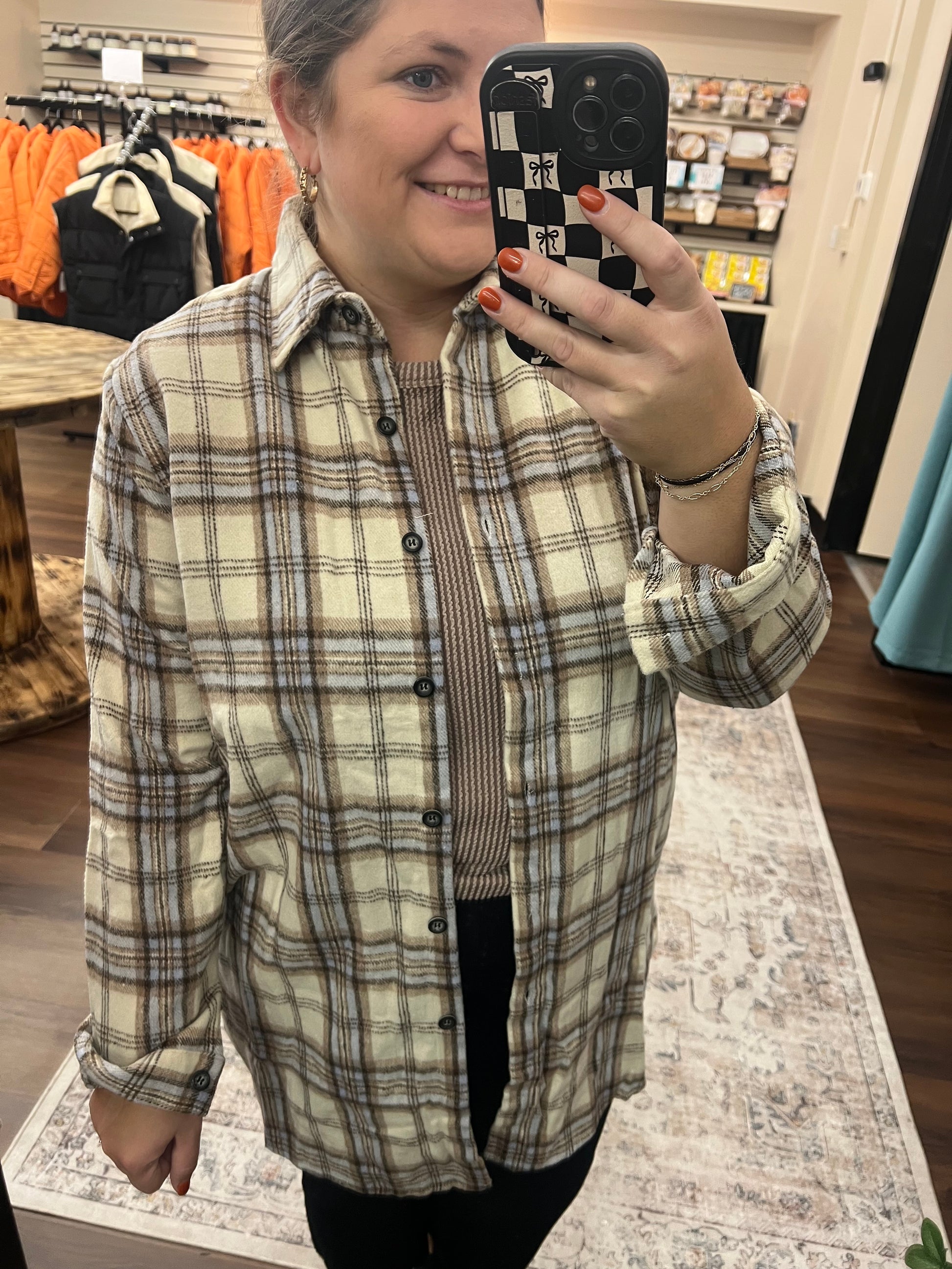 "Shacket season might just be the best season! This one features neutral tones with a subtle pop of blue and the perfect length for layering. A must-have addition to your fall wardrobe!