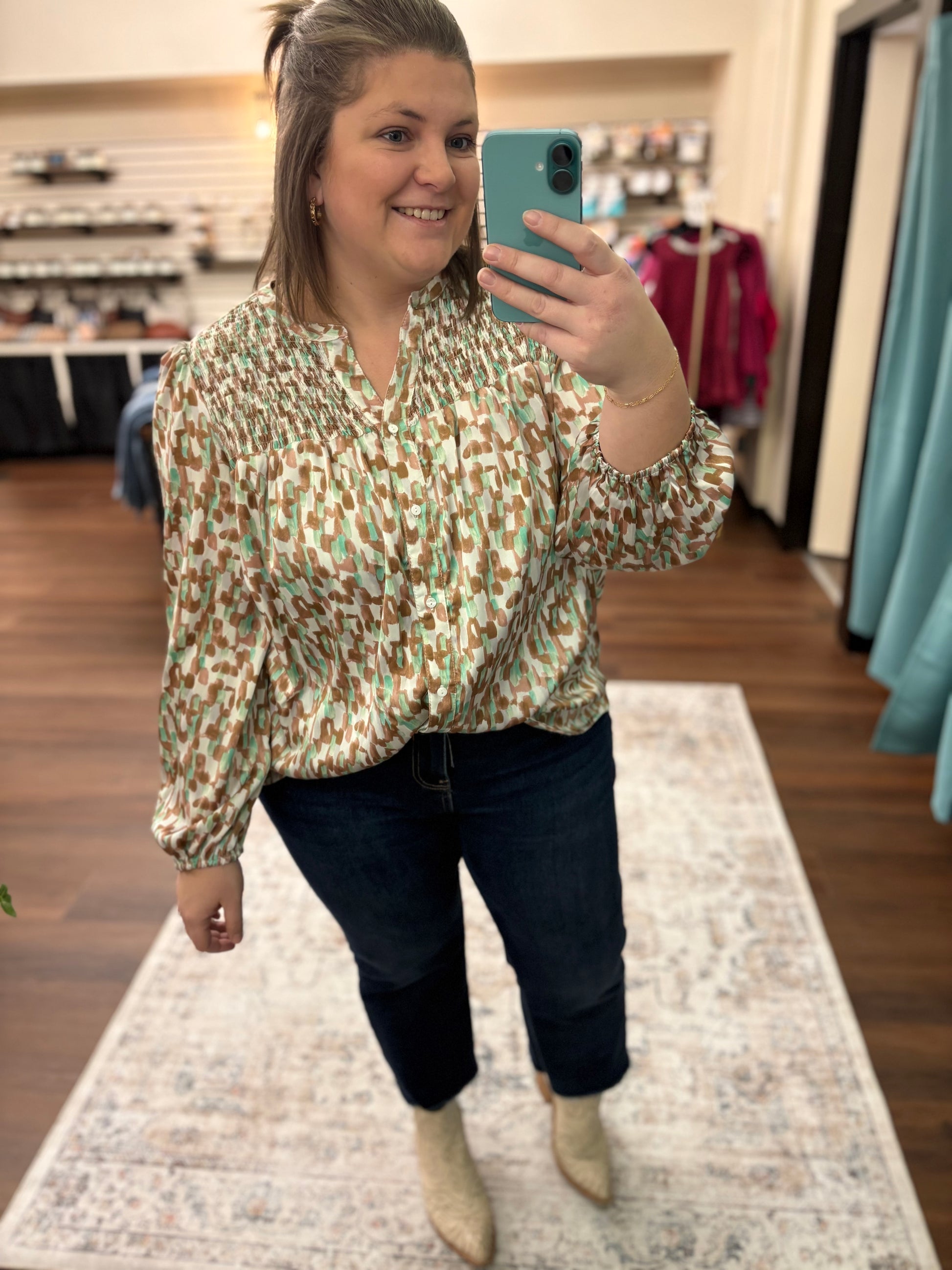 A color combo made for spring! The mocha helps keep a neutral feel while the mint adds the perfect pop. So many fun details including buttons, a smocked top portion, elastic bands on the sleeves, and the perfect flowy fit. Pair with denim or dress it up for work!